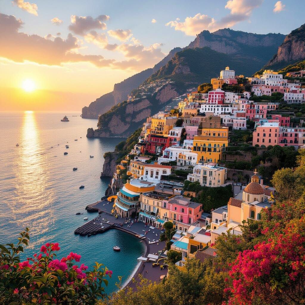 This image shows a vibrant, high-resolution view of the Amalfi Coast at sunset. Pastel houses cascade down a cliff to the sea, with lemon groves and flowers.