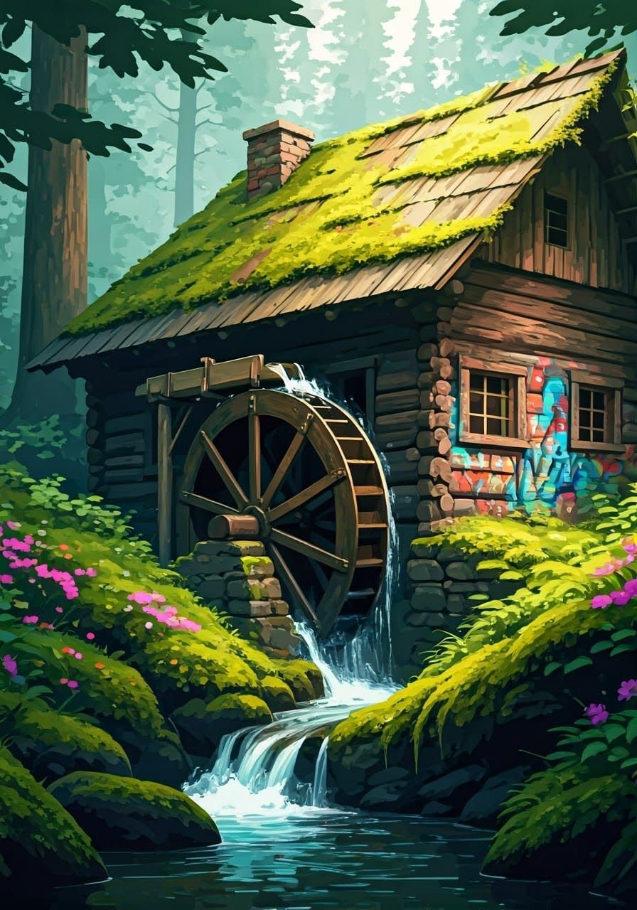 This serene image depicts a moss-covered cabin surrounded by lush foliage and vibrant wildflowers, with a rustic waterwheel turning beside it. The artwork blends street art and digital media, evoking a unique, high-contrast aesthetic.