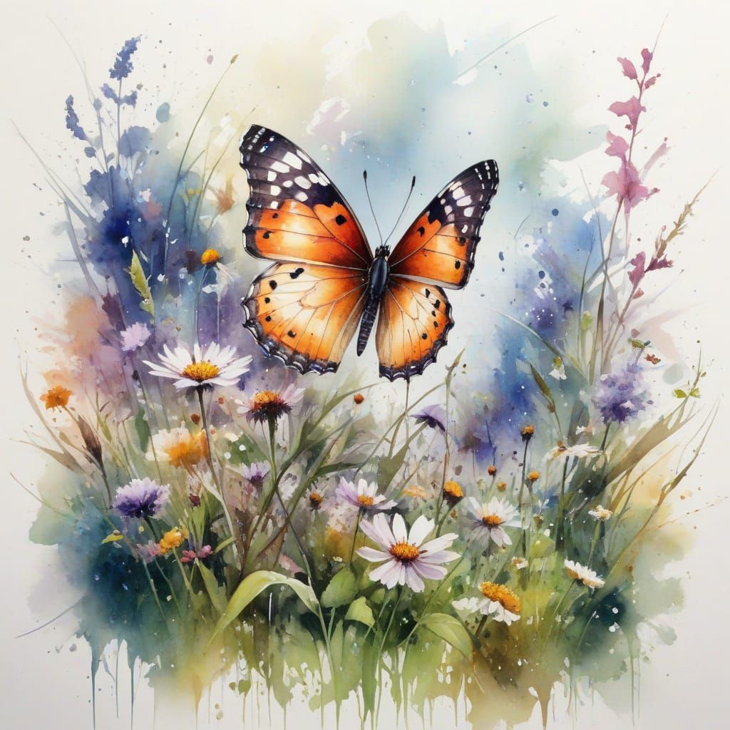 This image shows a delicate butterfly flying over a colorful meadow filled with wildflowers, captured in a fine-tuned stylized watercolor aesthetic with splashy white space.