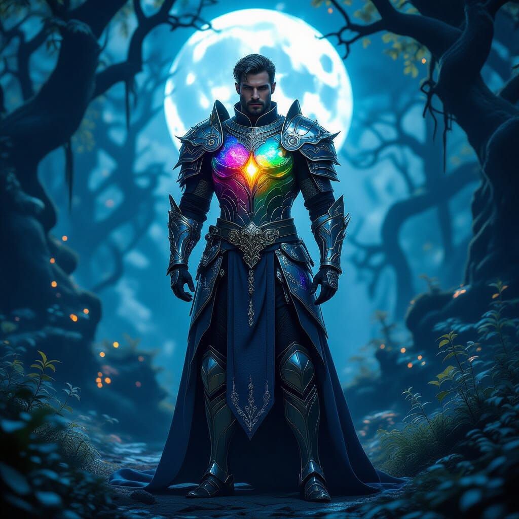 A knight in ornate, glowing glass armor stands in a mystical forest under ethereal moonlight. Rendered in a high-fantasy concept art style with dramatic lighting and magical realism.
