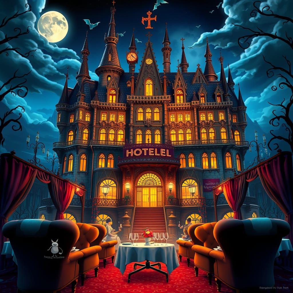 This enchanting movie poster, reminiscent of Pixar's vibrant style, transports viewers to a luxurious hotel in the mysterious moonlit backdrop of Transylvania. The hotel's Gothic-inspired architecture and warm, inviting restaurant create a sense of wonder and luxury.