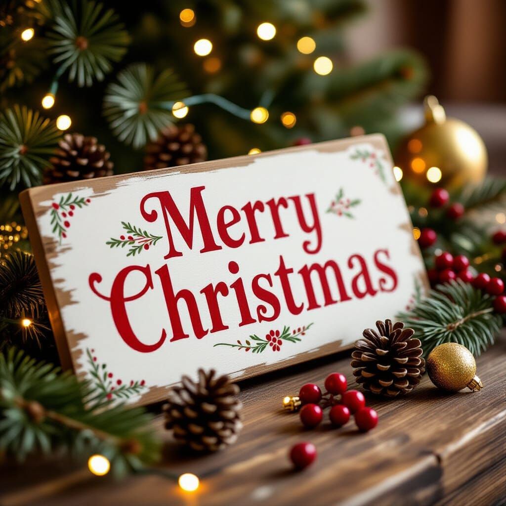 This image showcases a beautifully carved wooden sign with "Merry Christmas" in festive red and gold. Decorated with pine cones, berries, ornaments, and fairy lights, it creates a cozy holiday atmosphere with warm bokeh.