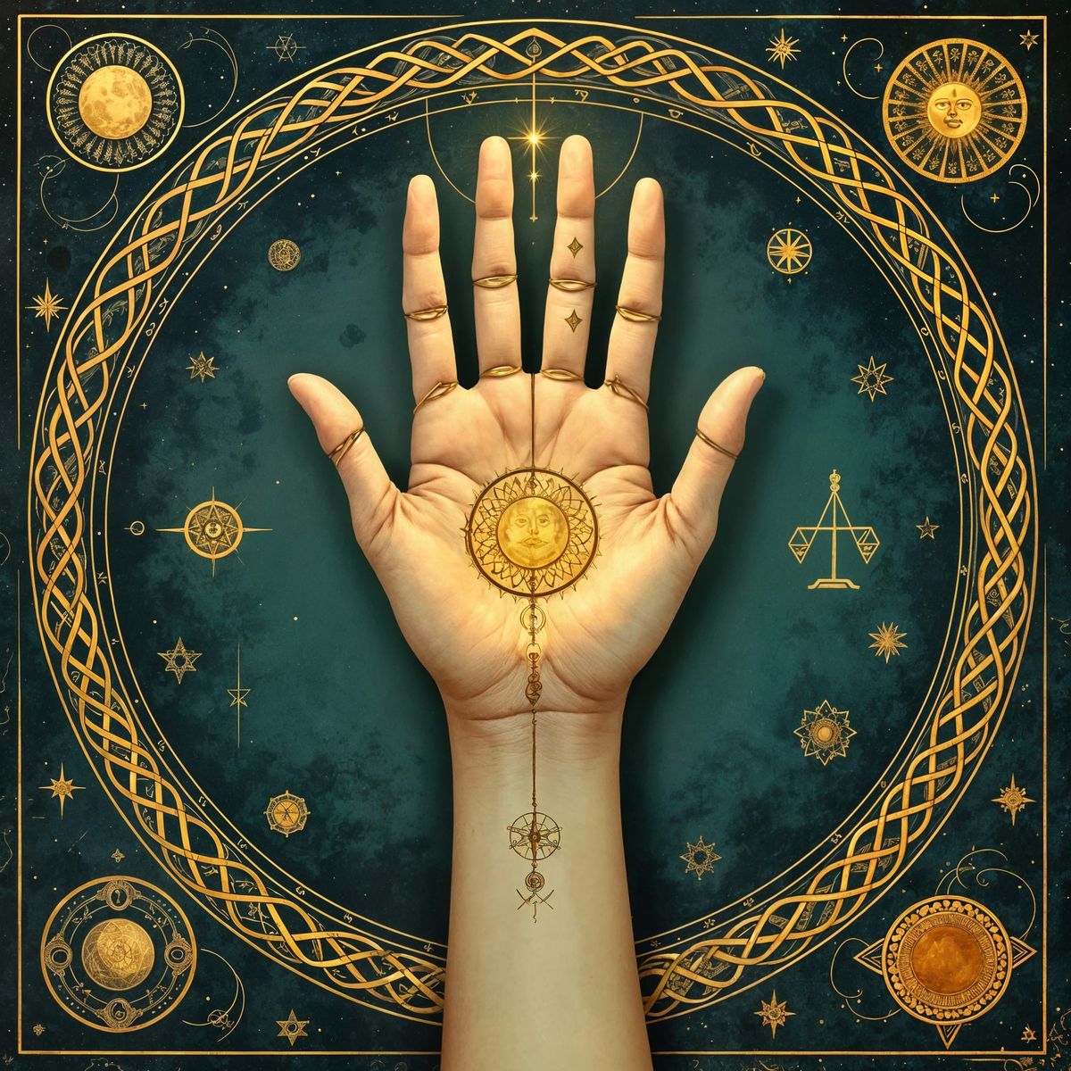 This image depicts a palm with softly glowing gold and silver palmistry lines. Esoteric astrological symbols are overlaid, set against a background of aged parchment and Celtic knotwork, in an occult vintage style.