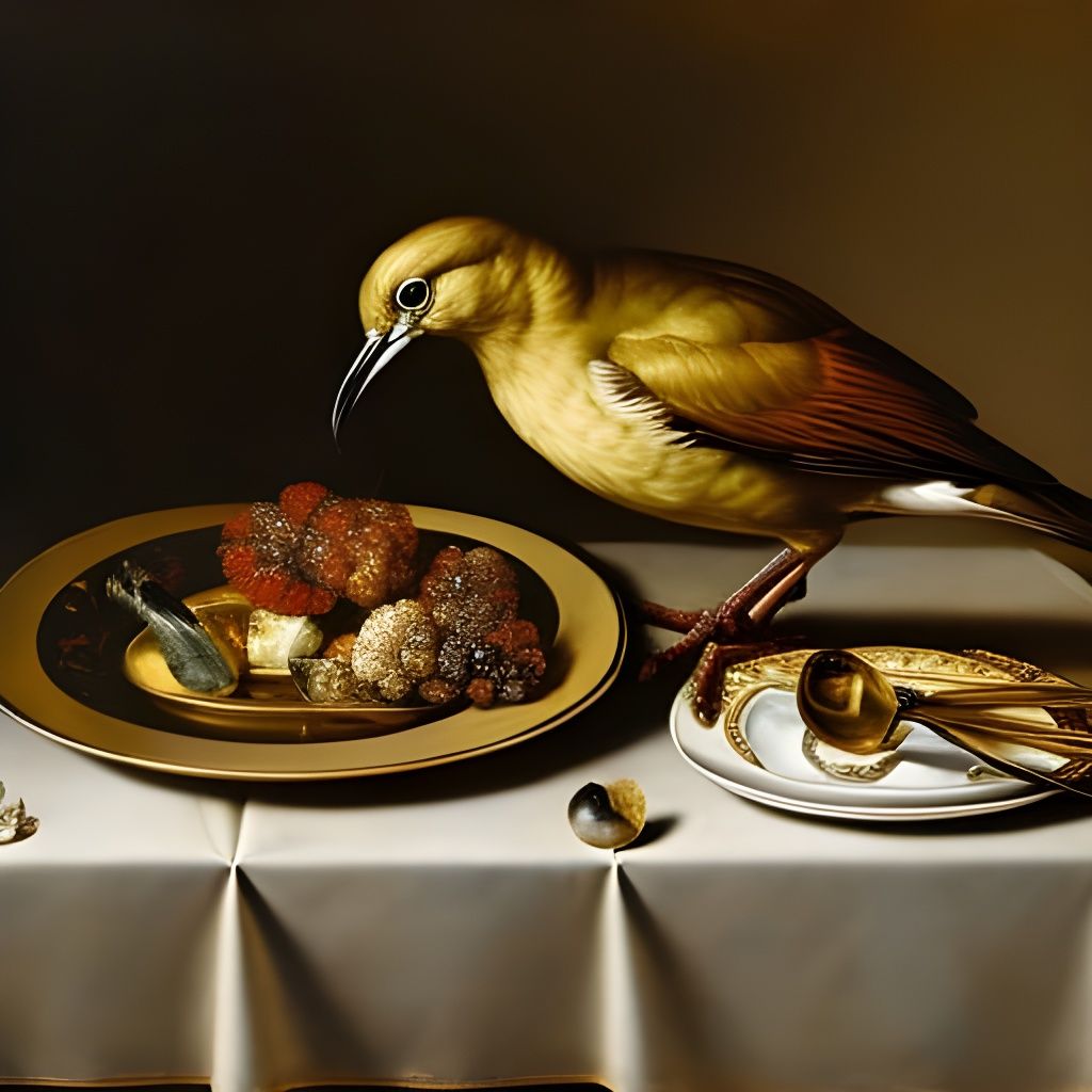 This image showcases a bird of prey consuming a heart amidst fruit-laden plates, rendered in a Baroque still life style. The artwork features deep colors, dramatic lighting, and sharp shadows.
