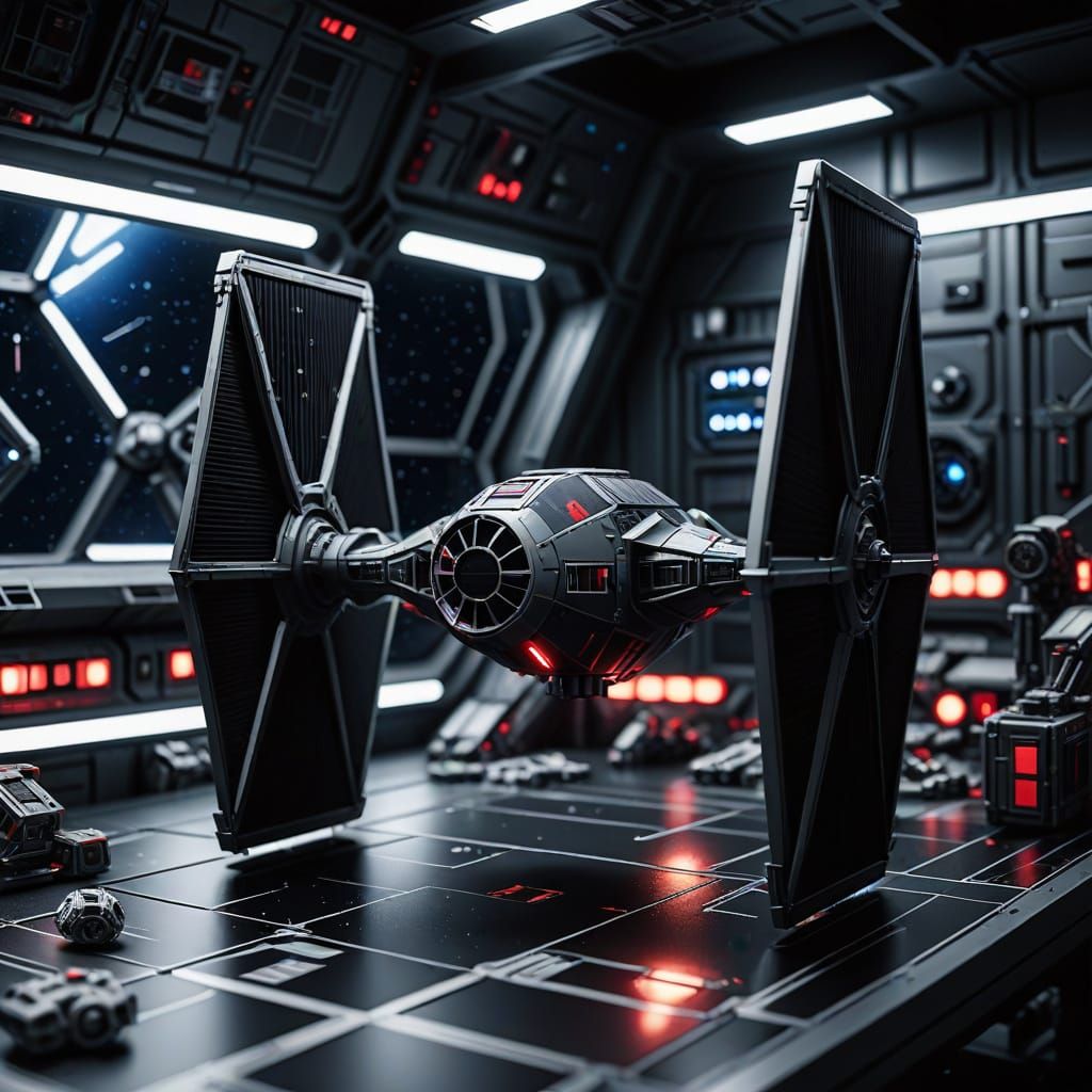 A highly detailed TIE Fighter model is showcased on a minimalist workbench, featuring sharp reflections, metallic accents, and a touch of Sienar Systems red in a photorealistic digital art style.