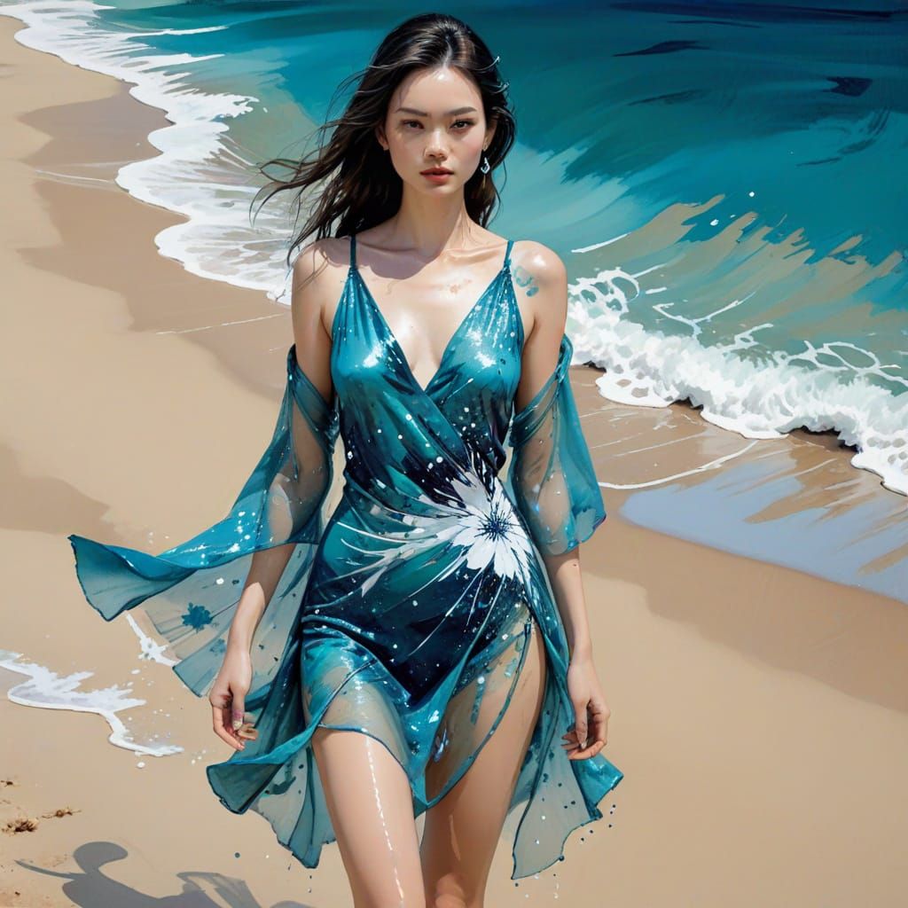 This image shows a model on a beach wearing an embroidered dress. The artwork is in the style of a Chinese ink painting with blue, teal, and white tones, enhanced by sfumato and sparkles.