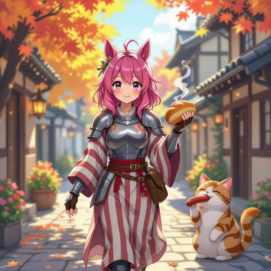 This image shows a detailed anime drawing of a young woman with pink hair and horse ears, wearing a robe and breastplate, walking in a medieval town with autumn colors. It features bright, deep colors and cel-shading.