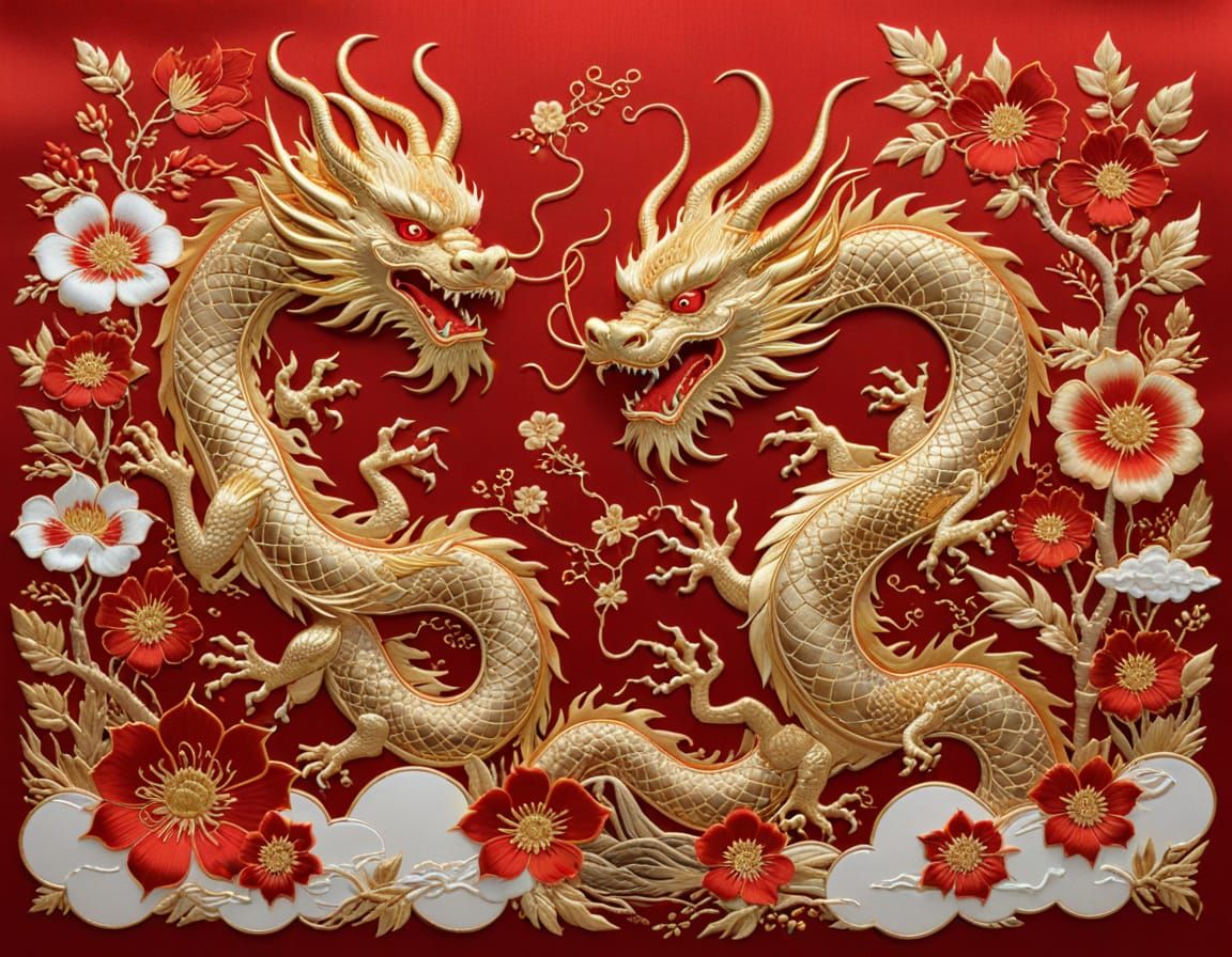 This image shows a high-relief embroidered artwork depicting Chinese dragons and flowers. The color palette is dominated by rich reds and golds, creating a vibrant fantasy scene.