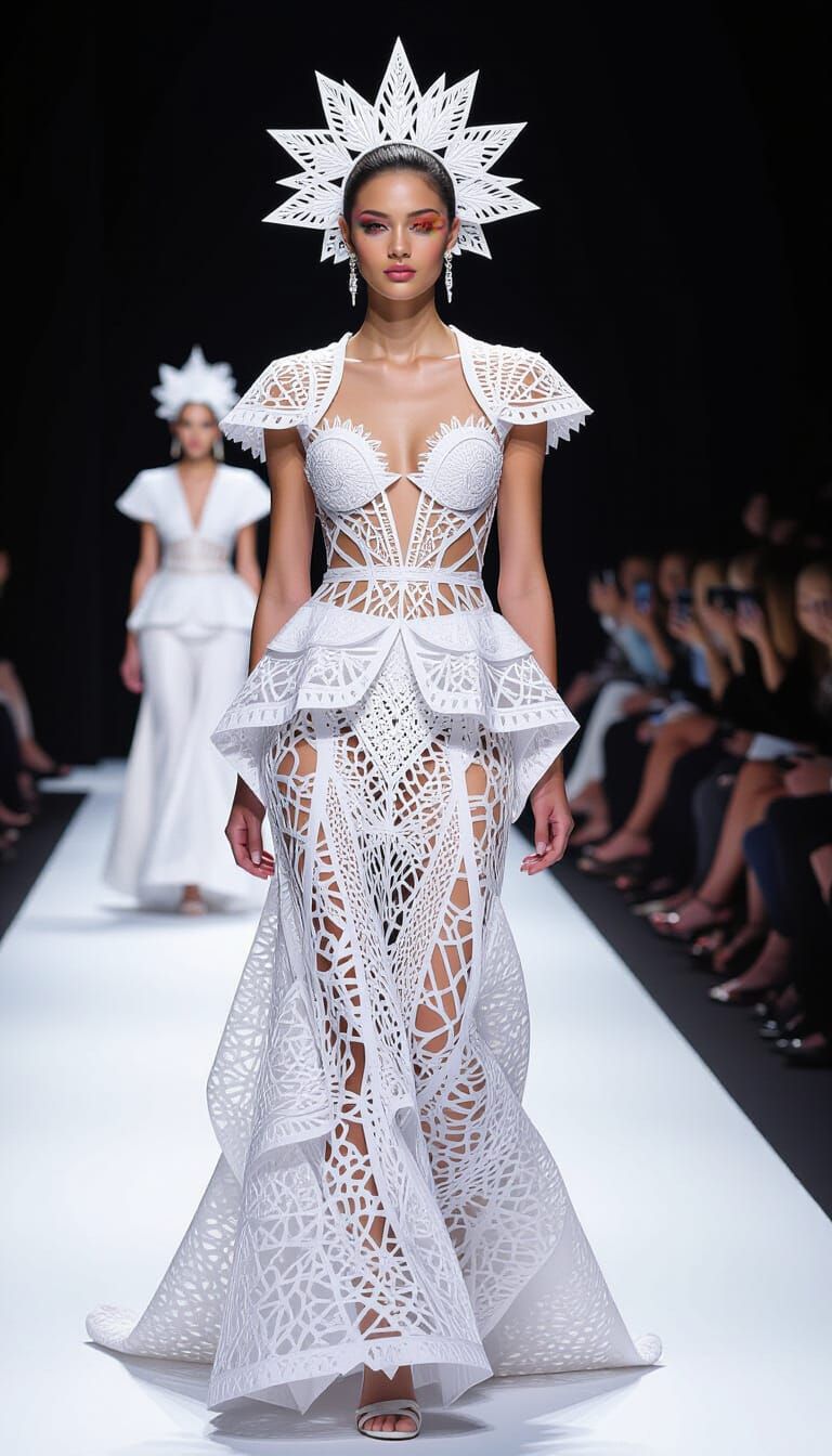 A haute couture fashion show featuring intricate origami designs with fractal patterns. The elegant, delicate lace creations evoke a unique Harajuku style.