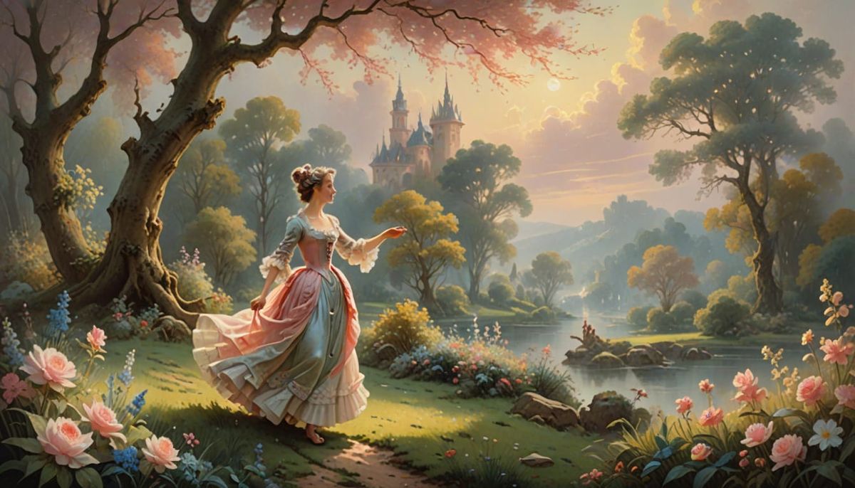 This image shows a serene and idyllic scene of an elderly woman dancing through a lush meadow filled with blooming wildflowers, captured in a soft, feathery brushstroke style reminiscent of 18th century French art.