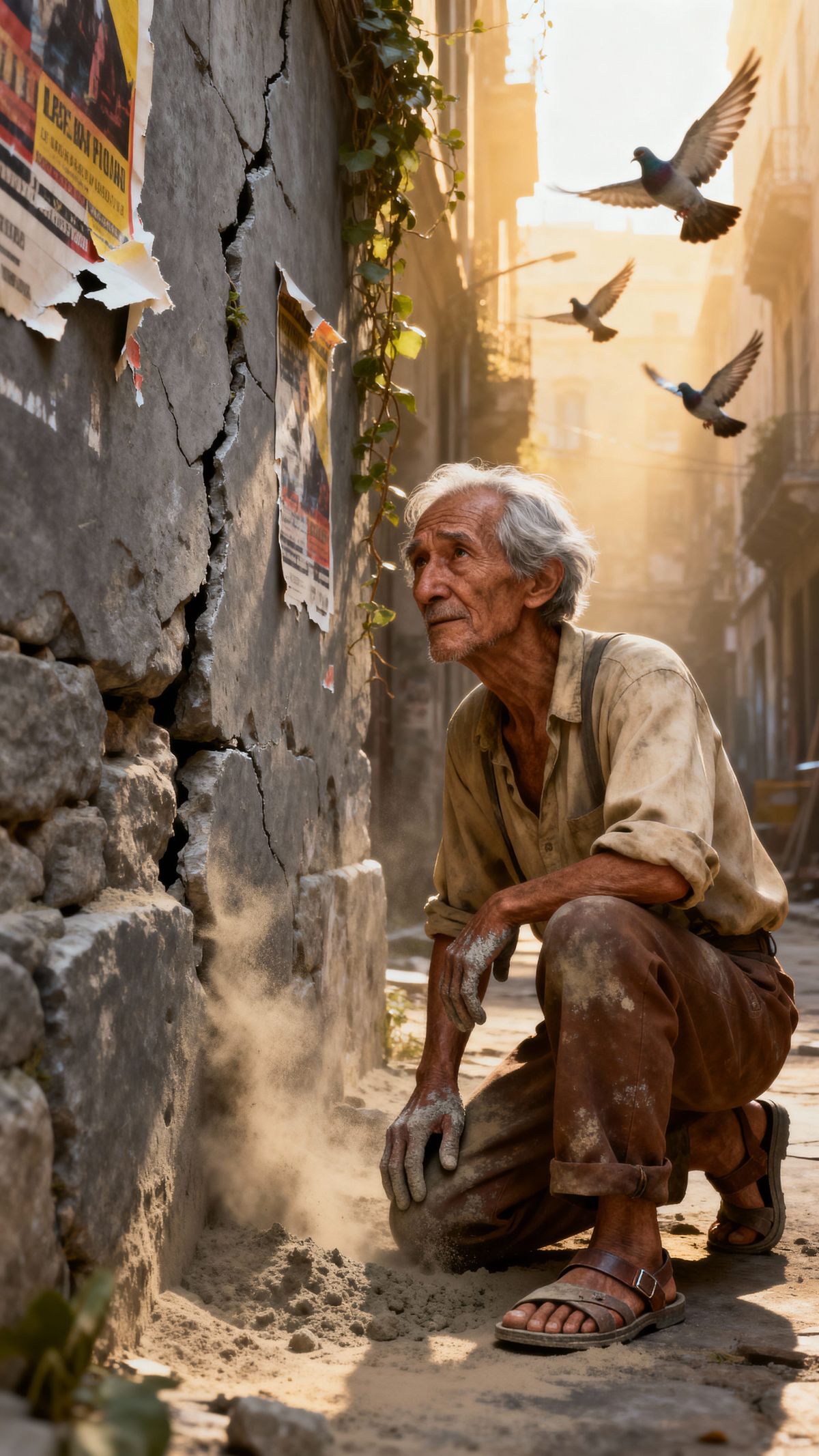 This image showcases an ultra-detailed 3D render of an ancient stone wall in a forgotten alley, featuring cracks, vines, and dust. An elderly mason kneels nearby as golden sunlight illuminates the scene.