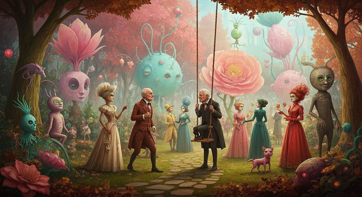 This image shows a grandfather enjoying a swing ride pushed by his grandchild. This fantasy concept art features deep, complementary colors and intricate details, rendered in 8k resolution.