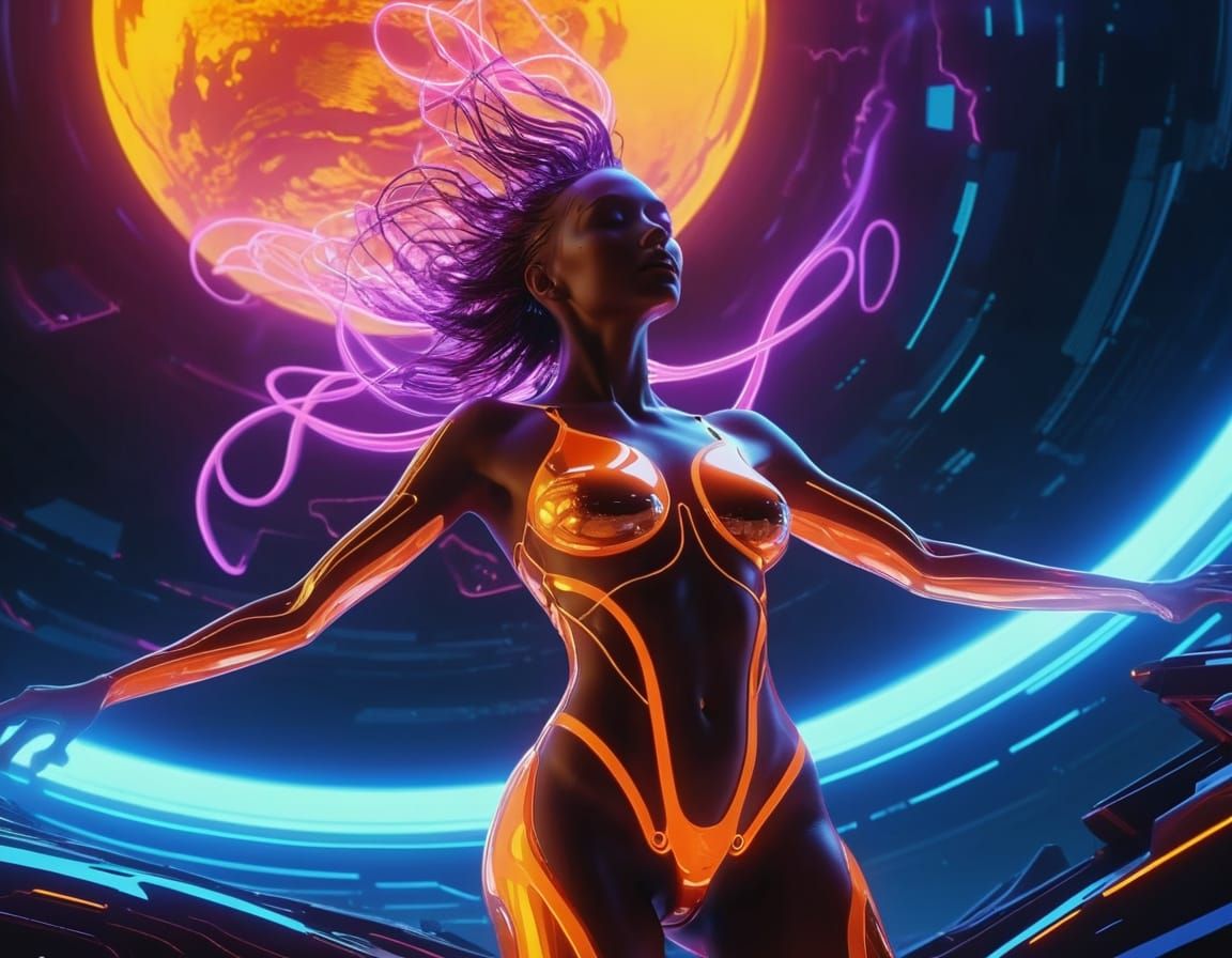 This electrifying image captures a woman bursting forth from a planet's surface, radiating pulsating energy and vibrant colors in a Syd Mead-inspired, high-contrast cyberpunk scene.