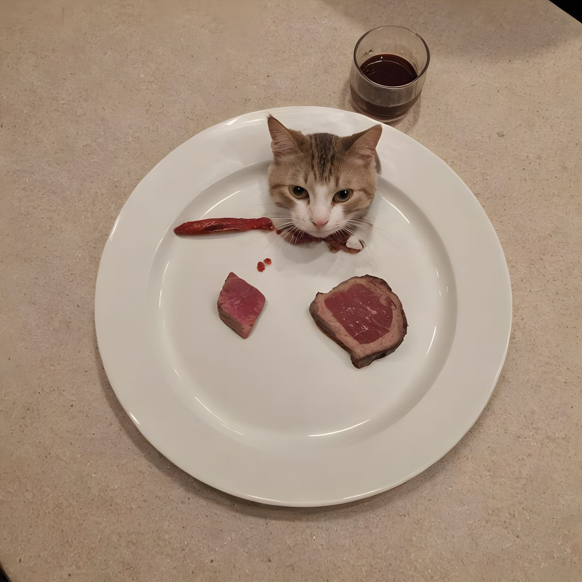 This image shows a cat brazenly stealing a steak from a man's dinner plate. The scene captures the humorous moment of the feline's food heist.