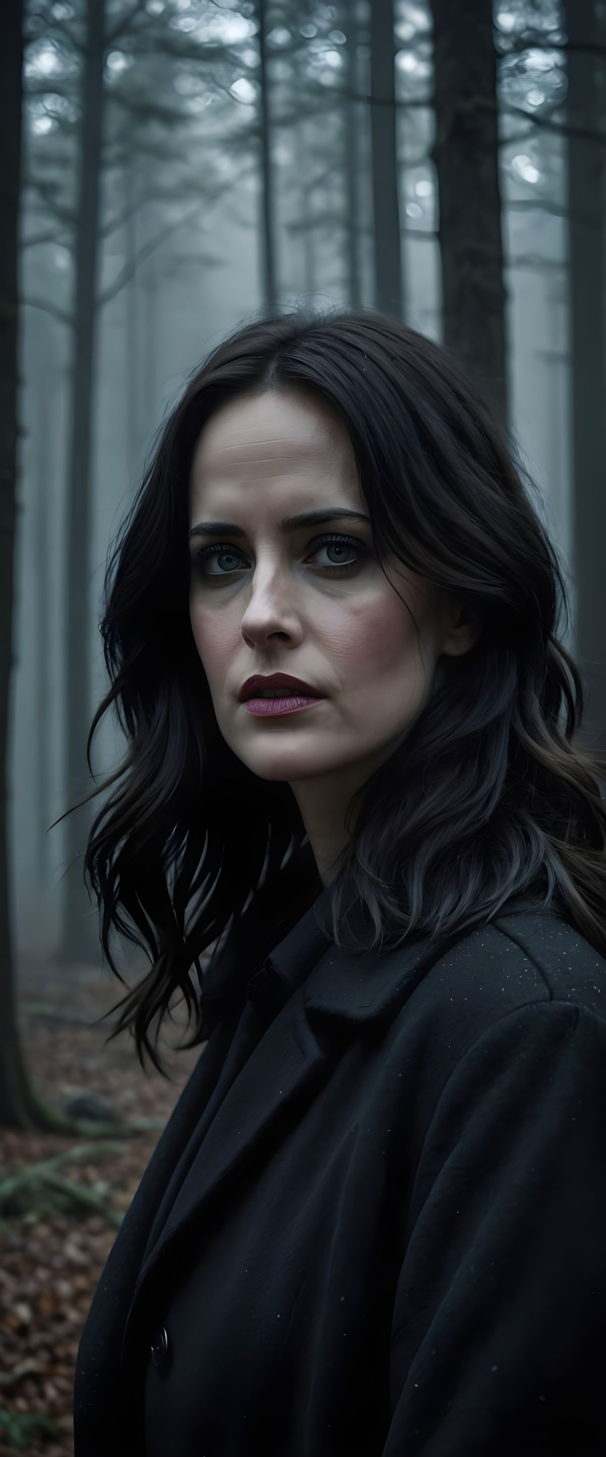 This image captures a photorealistic portrait of a mysterious woman in a dark, misty forest at night, with a black modern coat and a striking, aquiline nose, set against a backdrop of tense, high-contrast colors.