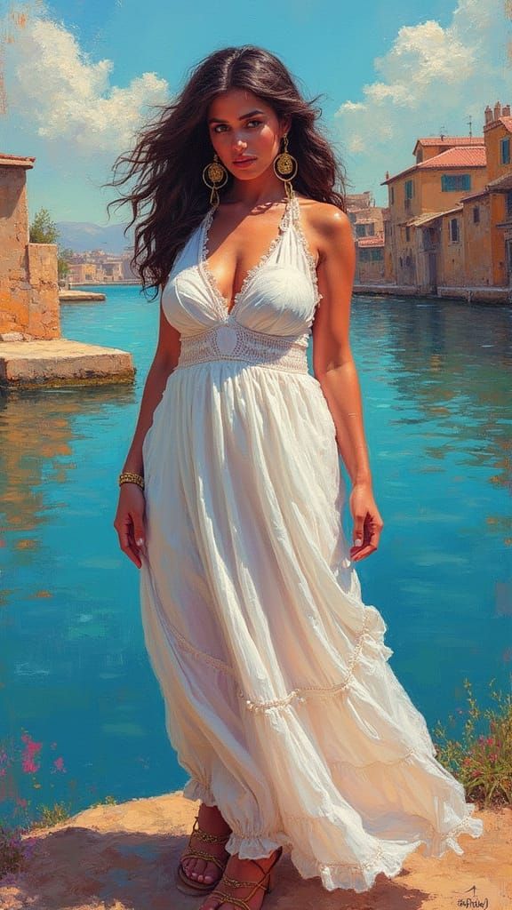 A digital oil painting of a beautiful Palestinian woman in a white bohemian dress by a river. The vibrant, polychromatic artwork blends graffiti textures with Persian elegance, featuring bold, high-contrast colors.