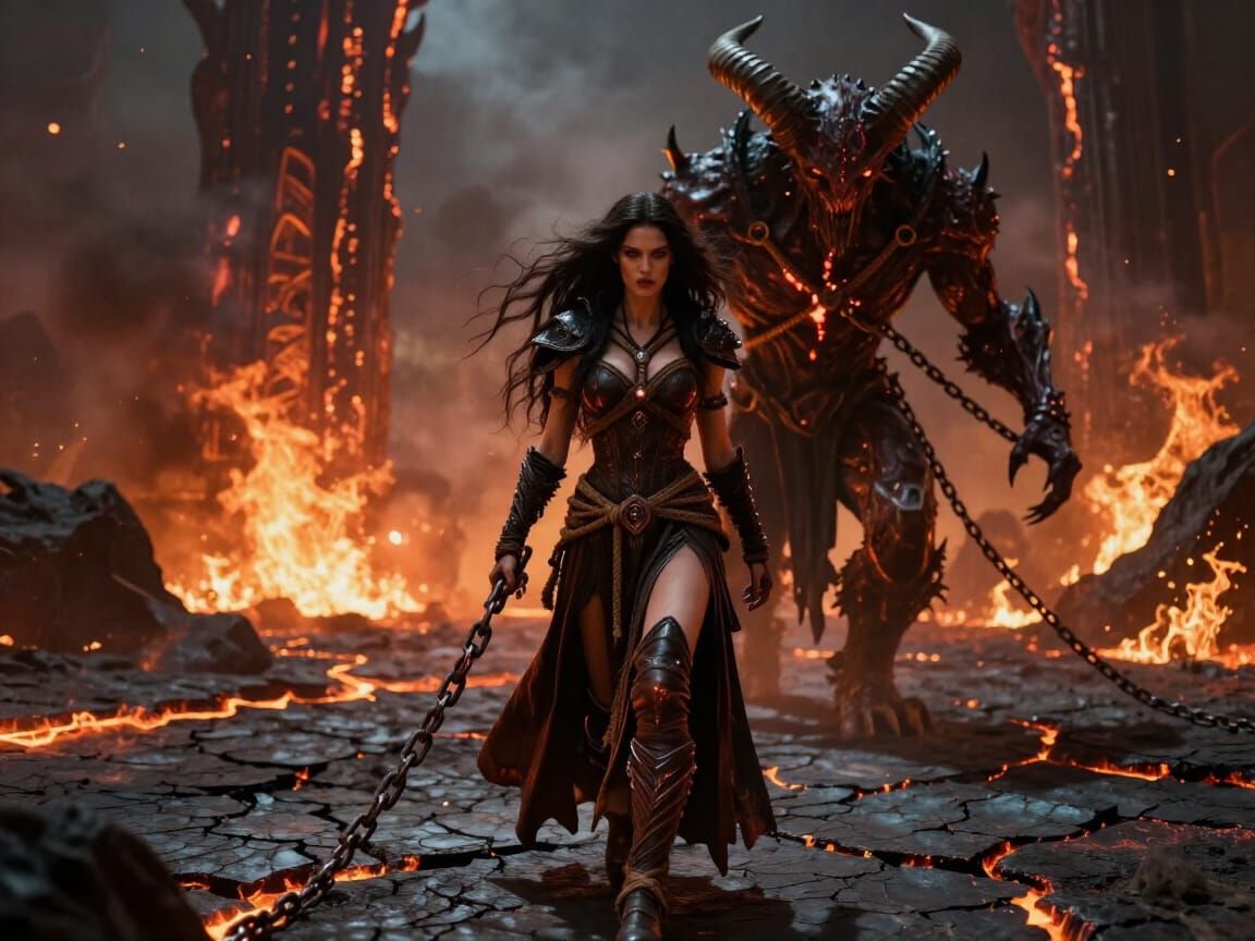 A dark fantasy scene on burning plains with lava rivers and demonic structures. A sorceress in leather armor controls a monstrous Diablo with chains, showcasing absolute dominance. Cinematic realism, hellfire lighting, 8K detail.