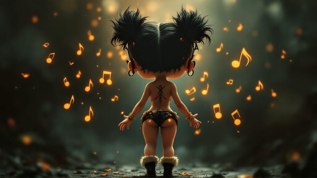 Intricate ink outline. Full-body portrait from behind. An adorable Betty Boop chibi babe standing in a dynamic feminine pose, wearing furry bear skin knickers, pony-tail hair styling. Delicate caramel and tangerine orange musical notes and staves swirl around her, blending into her body and hair. Dramatic ...