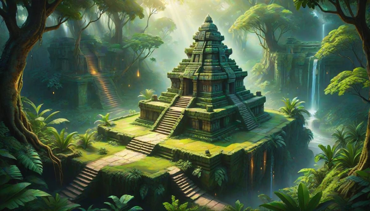 A striking picture of a fantasy woodland landscape. A fairy kingdom and Mayan jungle temple blend seamlessly in this vibrant oil painting, illuminated by dappled sunlight and fireflies.