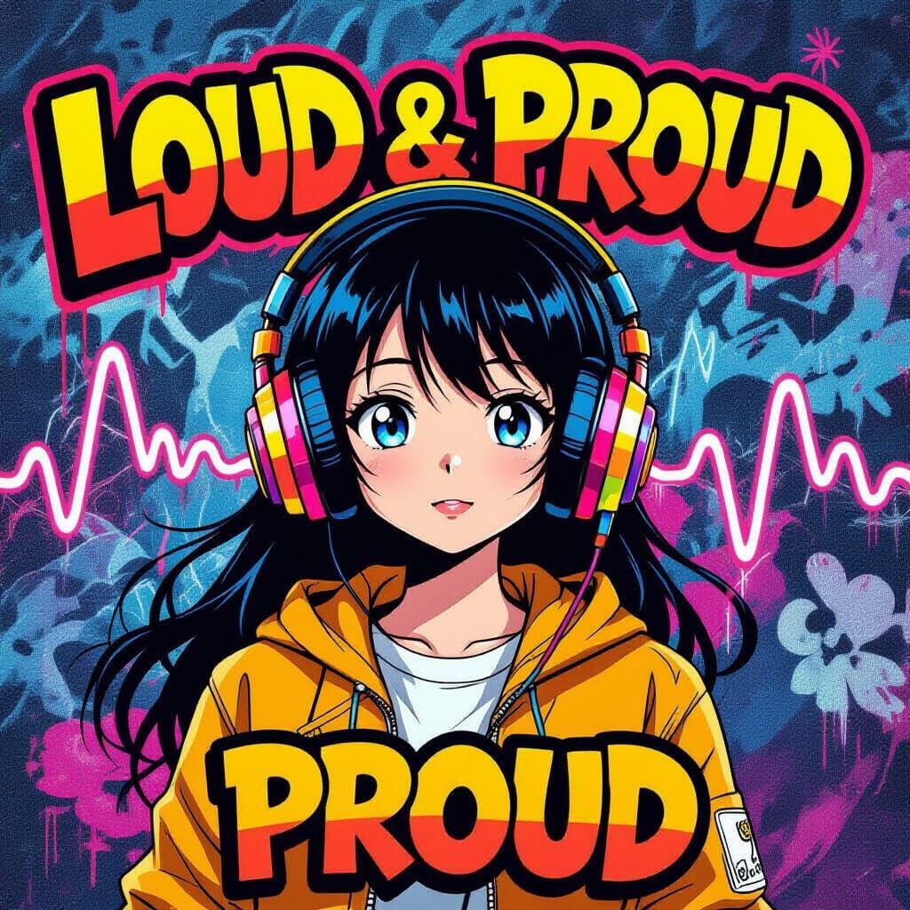 This vibrant vector art features an anime character with colorful headphones amid neon sound waves and graffiti art. The bold typography echoes a playful, energetic aesthetic.