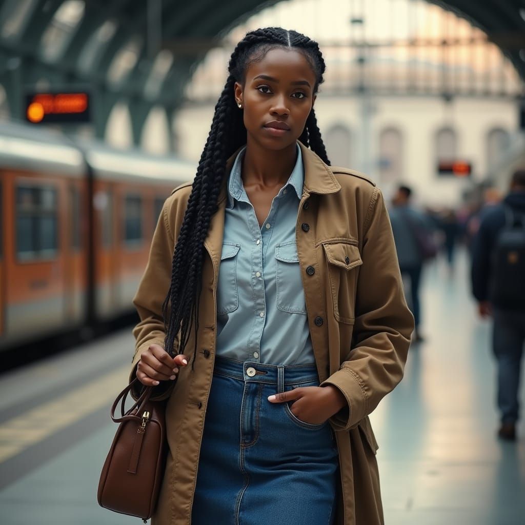 This hyperrealistic image shows a young African American woman with braided hair at a bustling railway station in the afternoon, holding her travel bag.