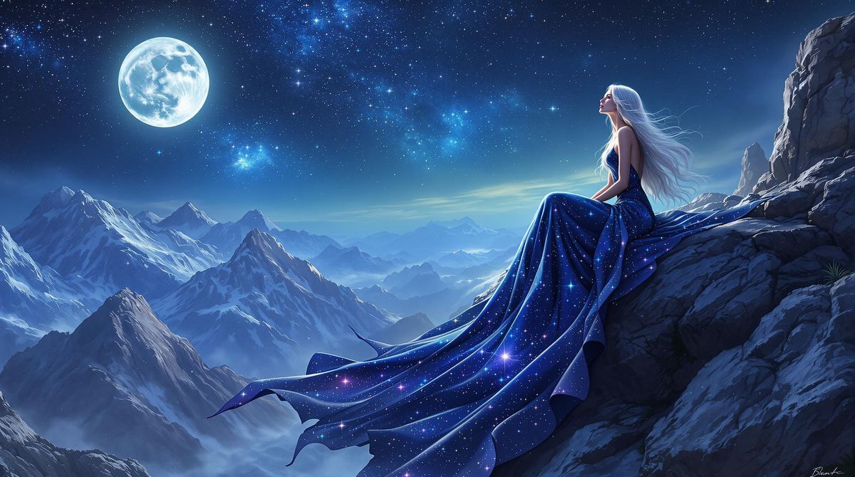 This image depicts a stunning fantasy woman sitting on a mountain outcrop, surrounded by dramatic moonlit peaks and a starry night sky. Her flowing gown shimmers with deep blues and purples, featuring glittering stars and nebula patterns.
