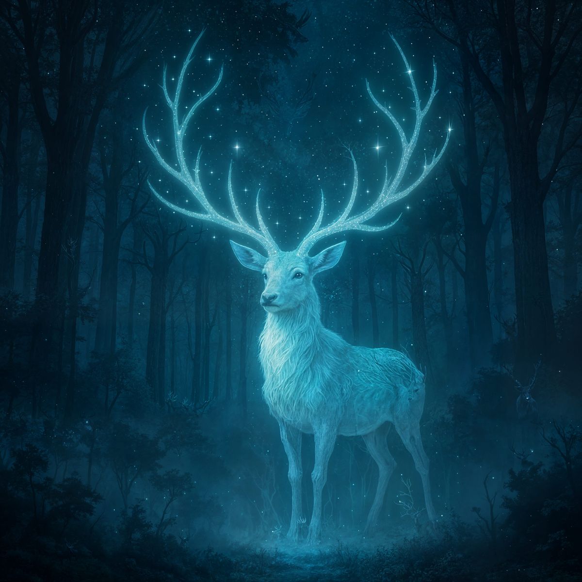 This image shows a mystical stag glowing in an enchanted forest at night. The stag's antlers twinkle like stars, set against a tranquil backdrop of blues, teals, and whites in a digital painting style.