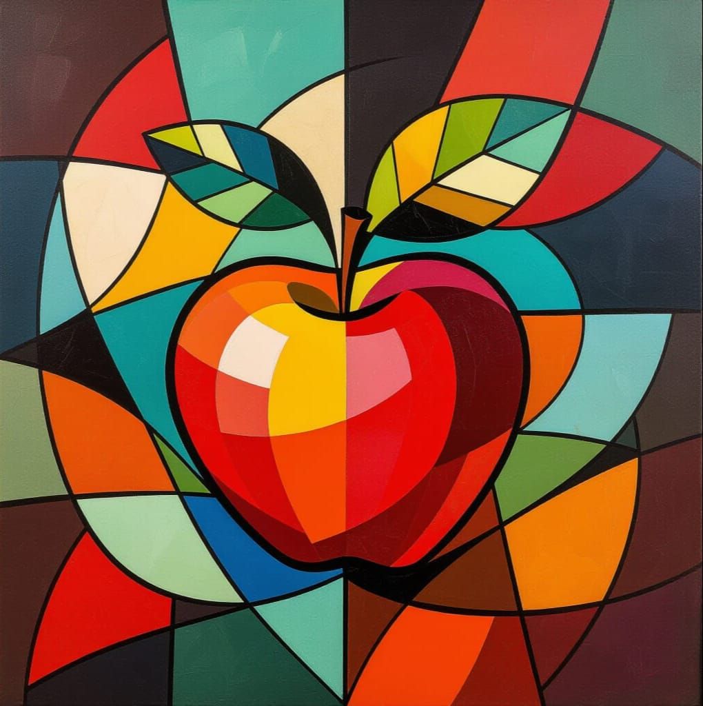A cubist abstract artwork featuring a heart-shaped red apple. The image features fragmented leaves in shades of green and orange, with swirling turquoise and crimson circles, in a bold, saturated color palette.
