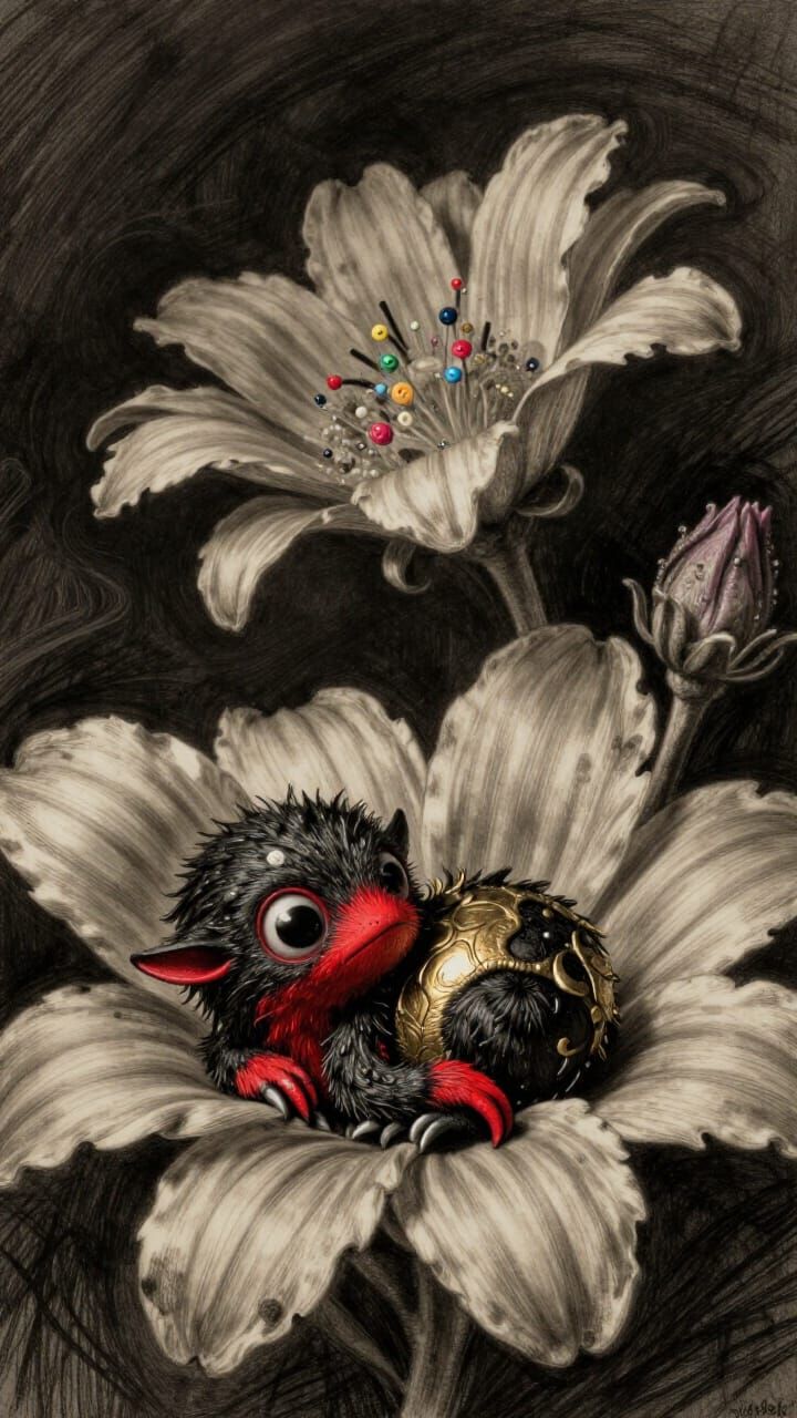A soft creature holds a golden sphere. A surreal resting creature sits on a white flower, clutching a golden orb with quiet intensity. Above it, sewing pins bloom like stamen — sharp, colorful, and strange. The contrast of soft fur and metallic detail creates a dreamlike tension. Is it sleeping, guarding, or simply waiting? This artwork blends fantasy and craft, inviting viewers to feel curiosity, calm, and unease all at once. Perfect for fans of whimsical surrealism, nature-inspired design, and imaginative storytelling.