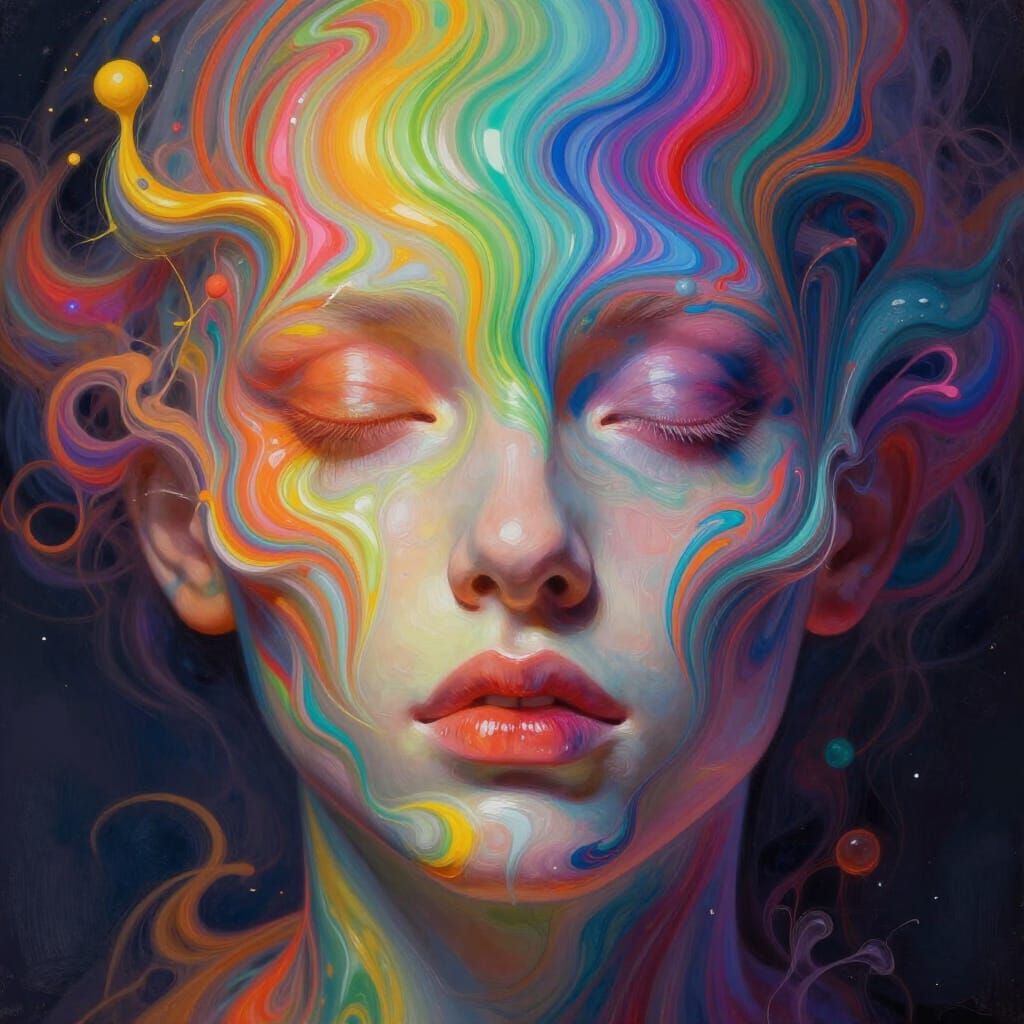 This image displays an ultra-detailed abstract portrait of a face composed of swirling, liquid rainbow colors. Dramatic lighting highlights vibrant hues and textures, with a dynamic, fluid digital painting style.