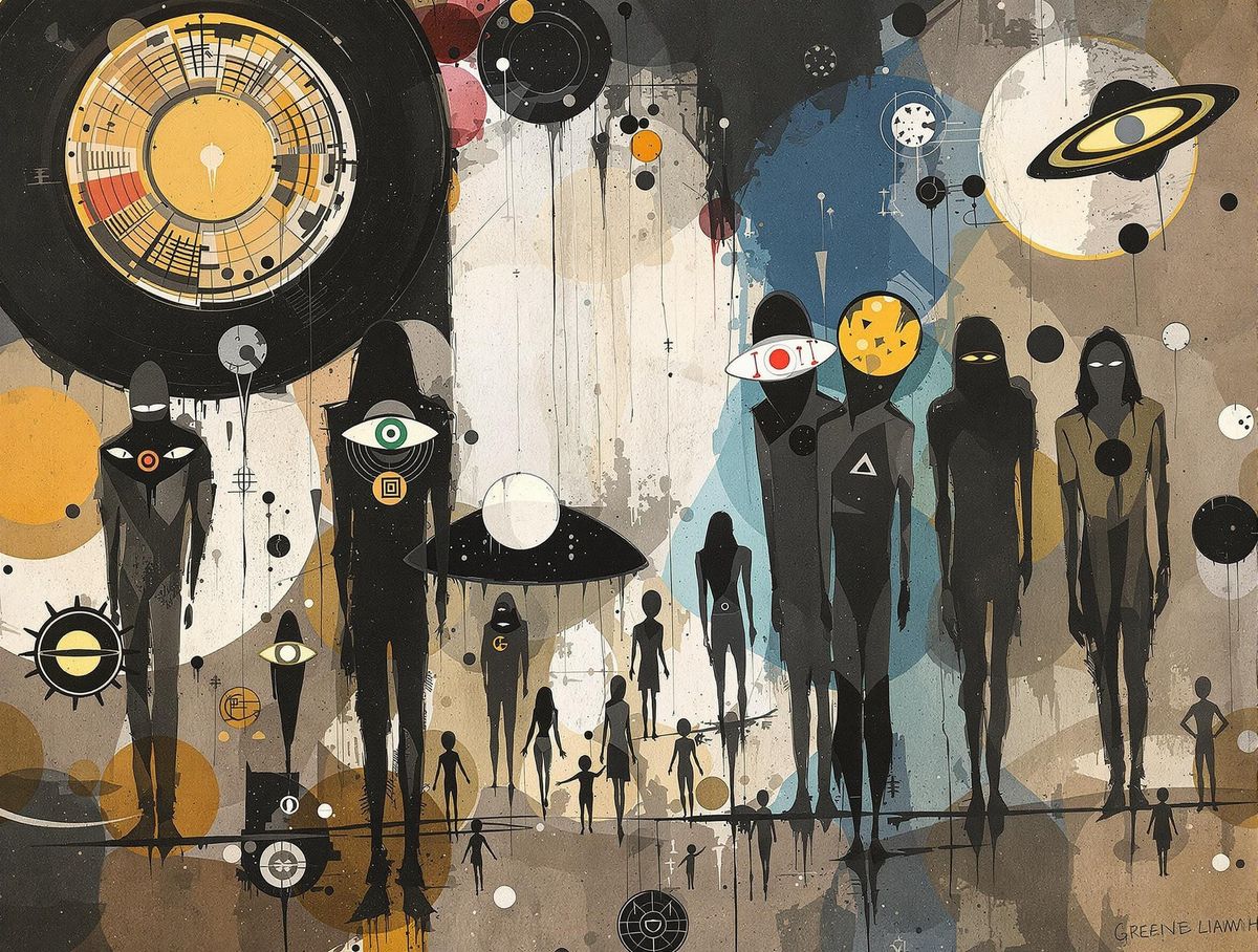 A digitally generated abstract image depicting early Native American culture. The artwork features charcoal glyphs, symbols, and otherworldly figures, reminiscent of neo and post-impressionist paintings with mythical elements.