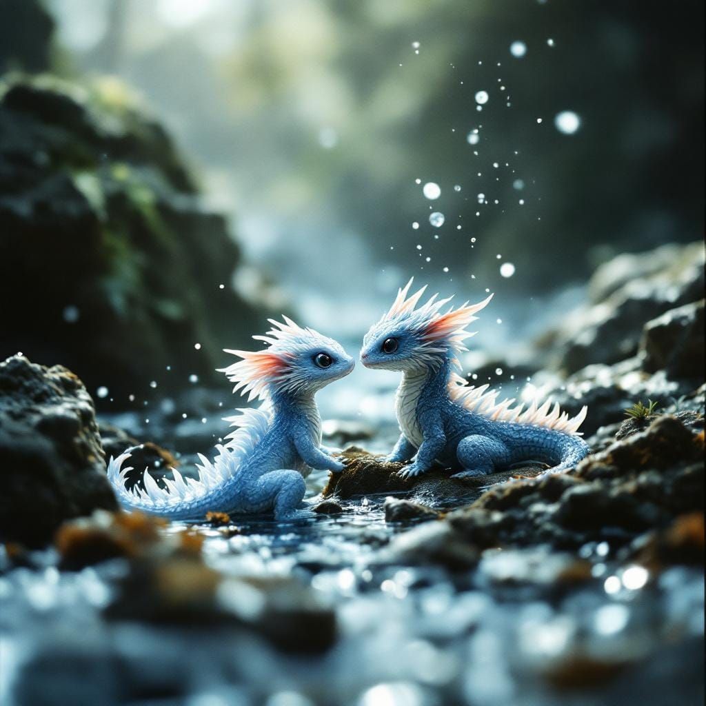 A cinematic image showing a baby water dragon with a shimmering aura playing with a stone-like earth dragon surrounded by rocks and plants. The scene features dramatic lighting and film grain.