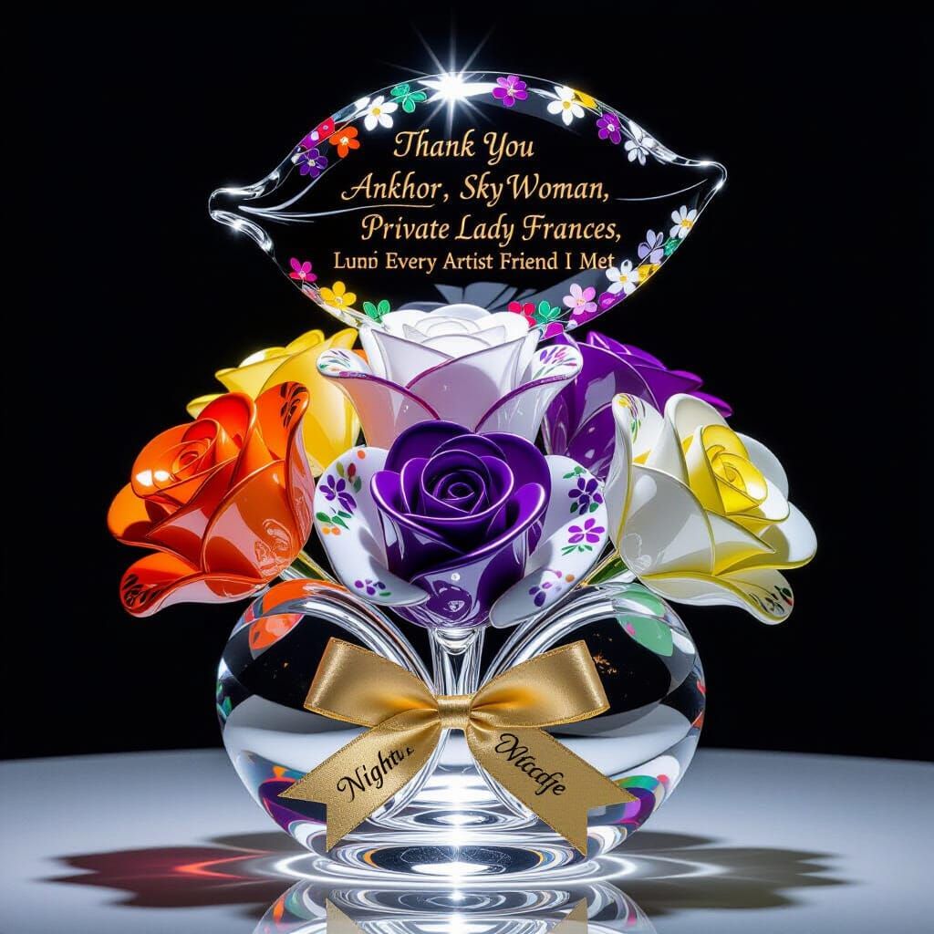 This image showcases a beautiful glass sculpture of roses adorned with intricate orange, white, purple, and yellow patterns. It features a crystal leaf engraved with a thank you message and a gold ribbon with 'Nightcafe' in calligraphy.