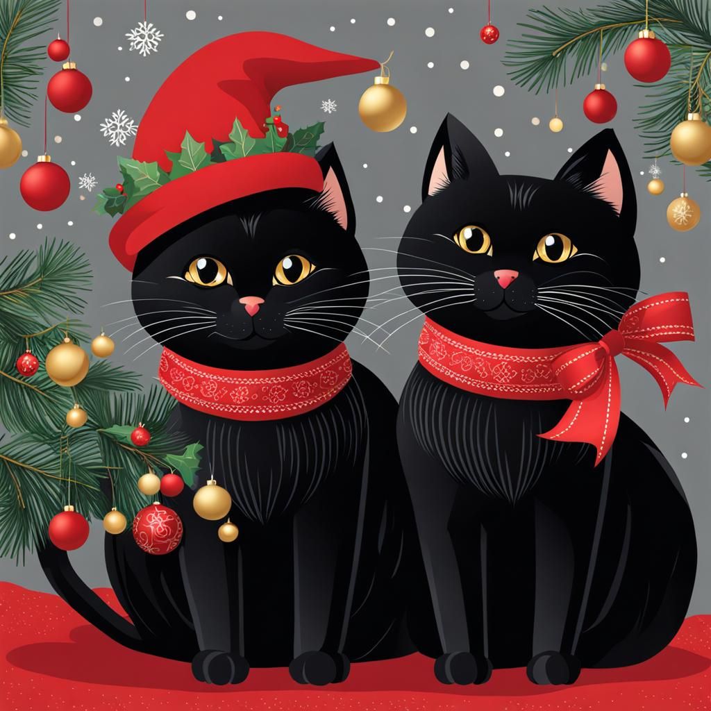 A charming image features two black cats celebrating a festive occasion. The composition captures their playful interaction and the joyful atmosphere of the event.