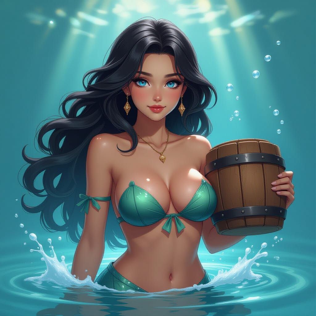 A stunning portrait of a mermaid with black hair and blue eyes holding a wooden barrel. The digital art features dynamic lighting, intricate details, and vibrant colors reminiscent of Art Nouveau.