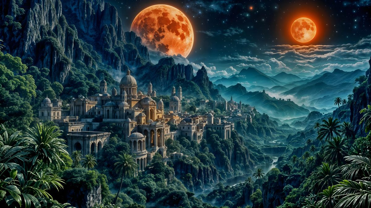 This image shows a breathtaking tropical city at night, built into the sides of black volcanic cliffs and surrounded by a lush jungle, under the light of a giant red moon and a star-filled sky.
