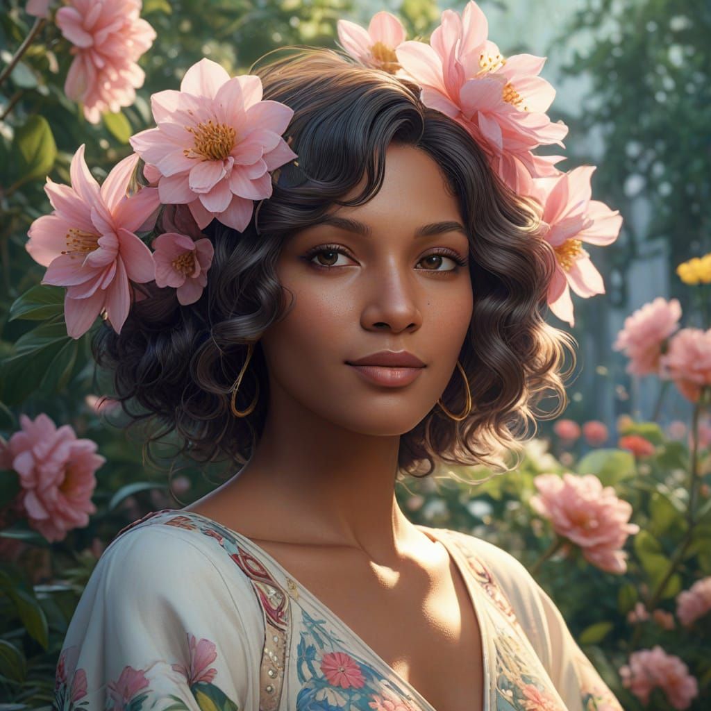 A stunning portrait of a woman surrounded by blooming flowers in a lush, vibrant garden, radiating elegance and beauty with soft, ethereal light and intricate floral patterns.