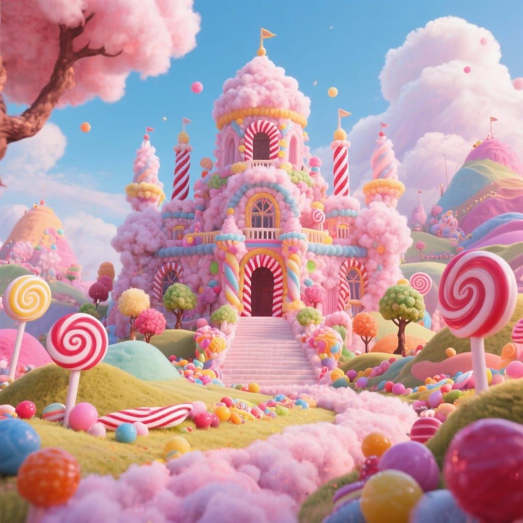 A vibrant, detailed palace constructed from sweets like cotton candy and licorice, set against gumdrop hills and lollipop trees, rendered in a distinctive digital art style.