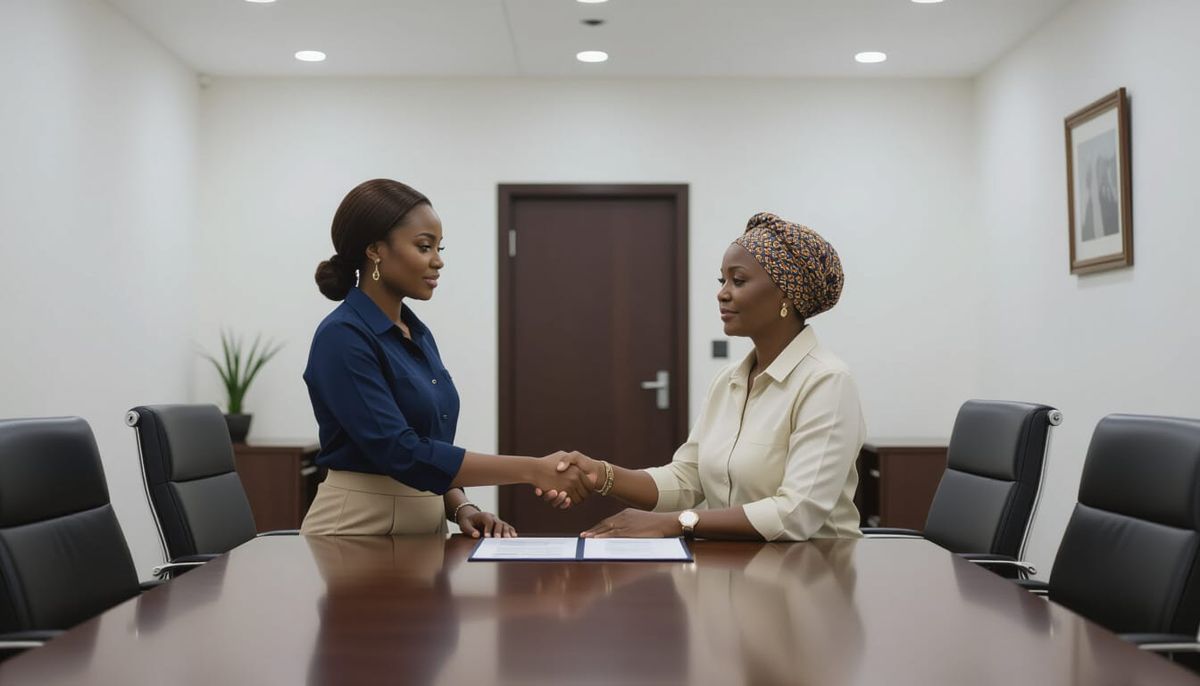 A realistic, cinematic scene unfolds in a modern Abuja law firm conference room, depicting a serious and tense discussion with dramatic lighting and exquisite detail.