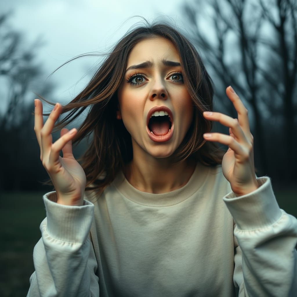 A poignant image of a sorrowful woman in a moment of anguish, her brown hair and eyes conveying a deep emotional pain.