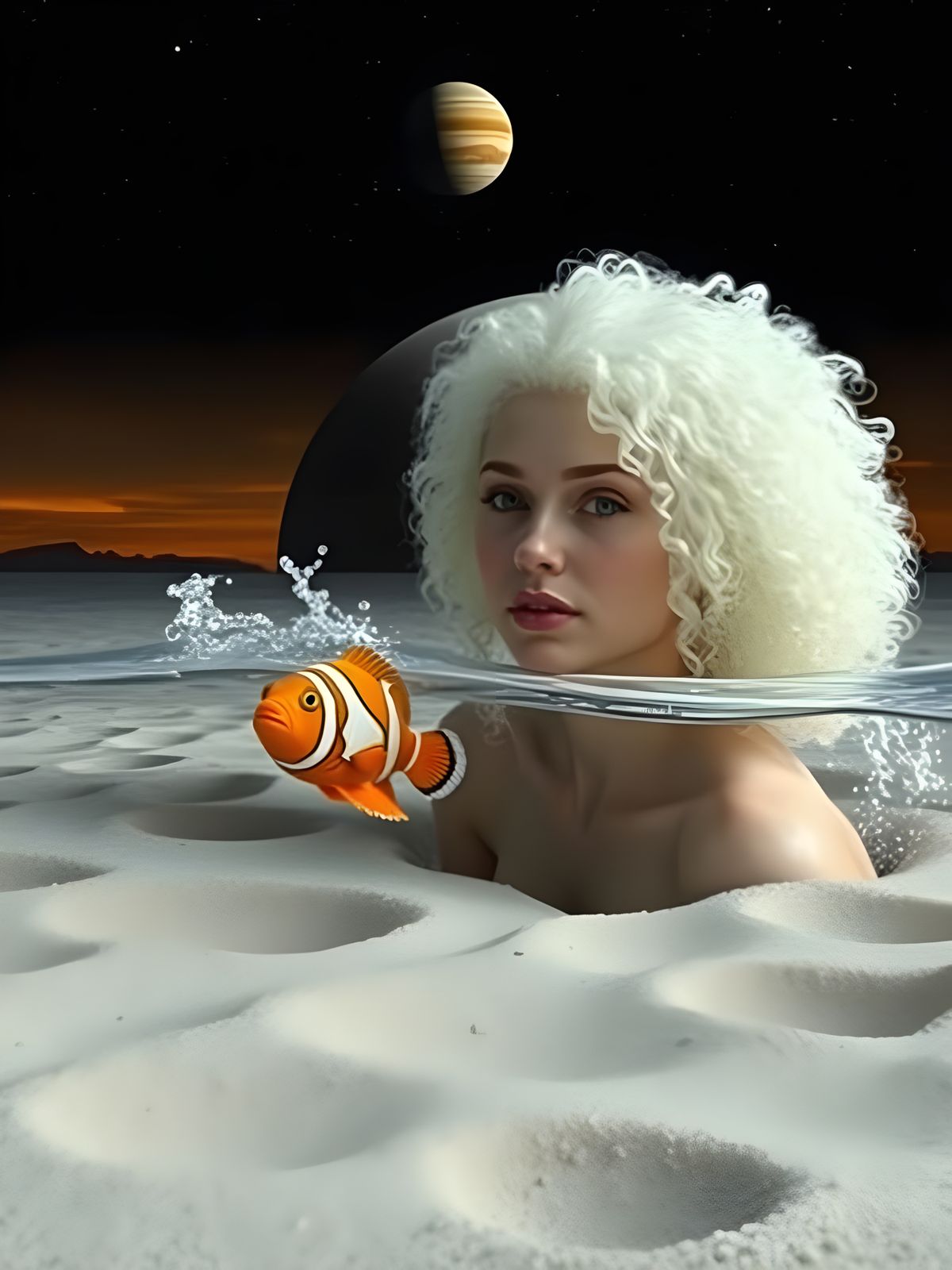 This striking image depicts a serene albino woman rising from a desolate, cratered moonscape, surrounded by the calm waters of a beach and the distant, submerged planet of Saturn, with a school of clownfish swimming nearby, set against a vibrant sunset backdrop.