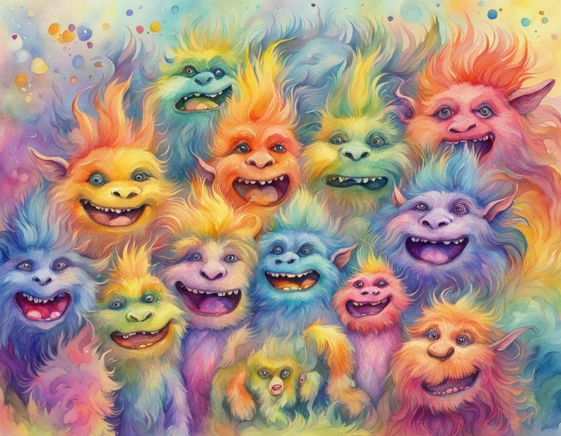 A watercolour painting of rainbow furry trolls playing in a pastel background. This whimsical close-up shot uses vibrant fauvist style with warm golden lighting and soft brushstrokes.
