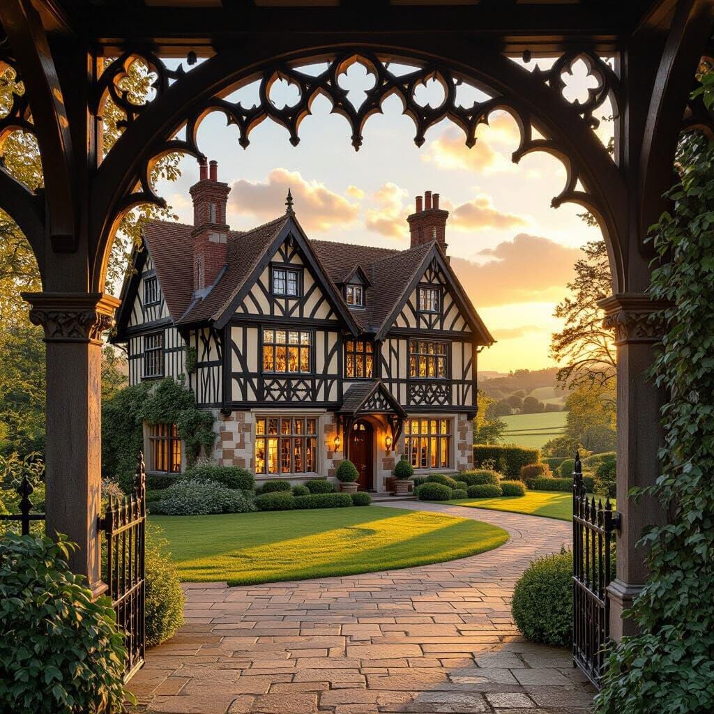 A picturesque English country home bathed in golden light. Gothic architectural details combine with a blend of artistic styles, from precise lines to romanticism and expressive colors.