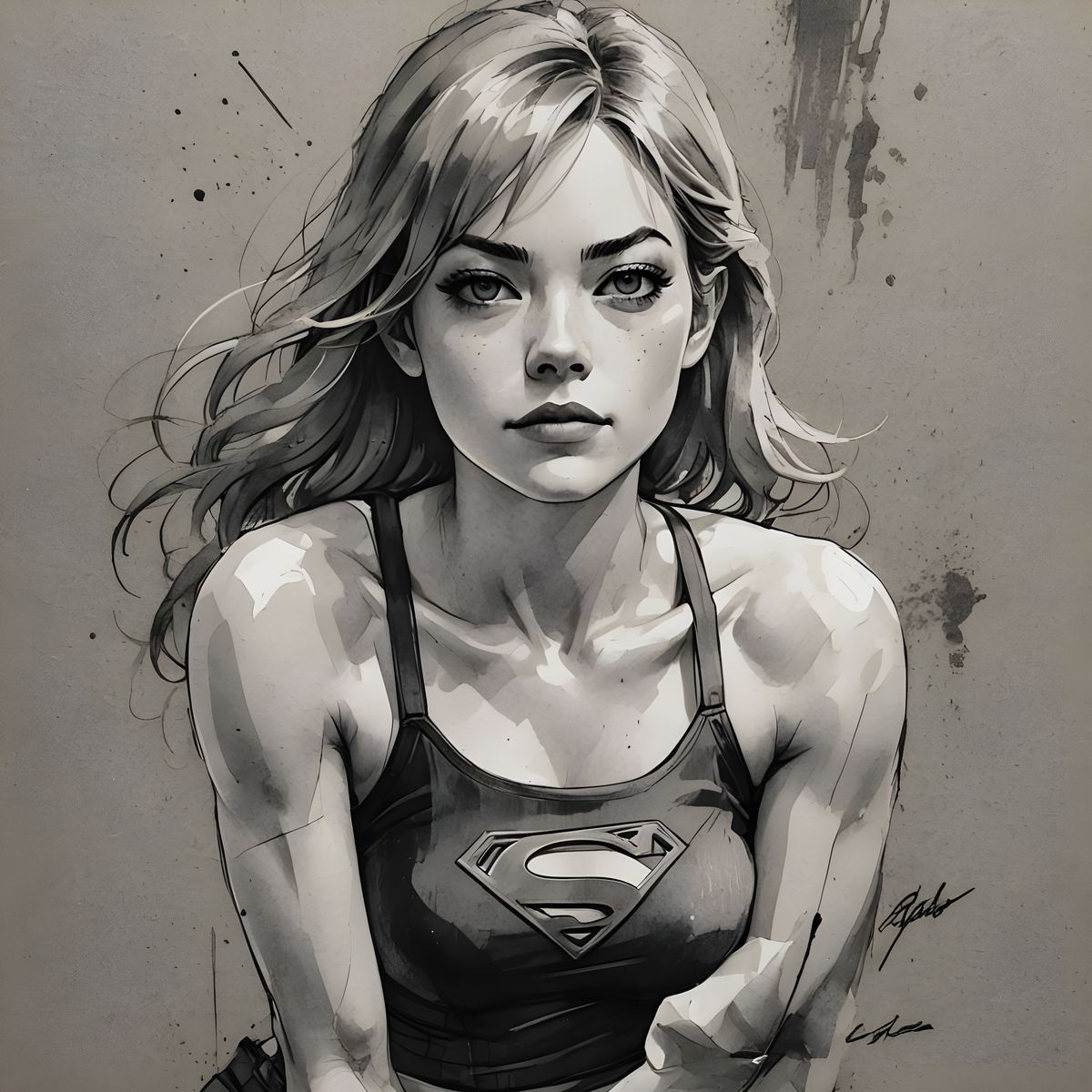 Ghibli-inspired Manga Fine Art. Head and shoulders. Emma Stone as Supergirl, posing heroically in short gym shorts and a tight tank shirt, deep neckline accentuating her confident expression. Fineliner pen and ink wash sketch. Sensual gray ink wash calligraphy line background in the style of Jeremy Mann. Rough textured paper, reminiscent of Wlop and Ilya Kuvshinov's artwork. Expressive brushstrokes, subtle gradient of grays, deep shading, dramatic pose, flowing hair, captivating eyes. Best quality, 4k resolution, detailed textures, atmospheric lighting, dynamic composition.
