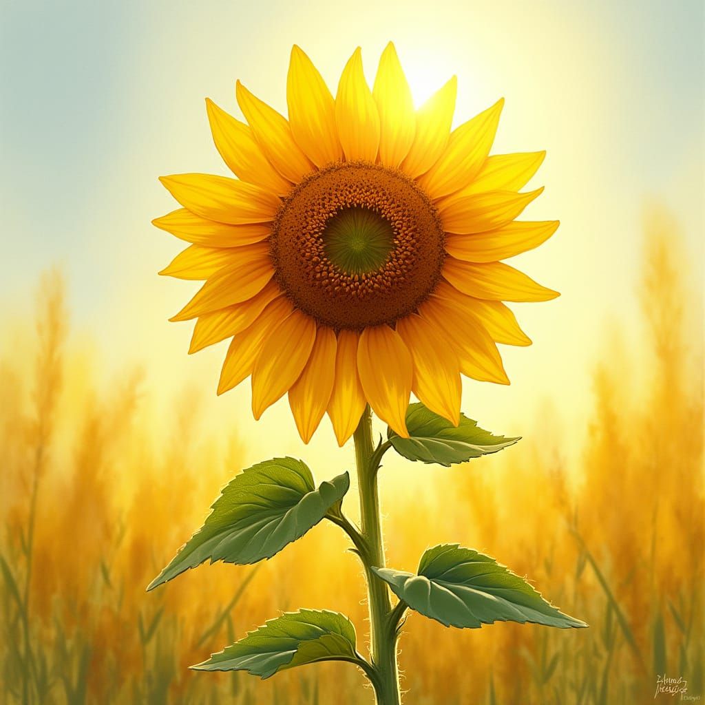 This image shows a bright and cheerful sunflower standing tall in a warm and sunny environment, with delicate details and bold colors reminiscent of impressionist art.