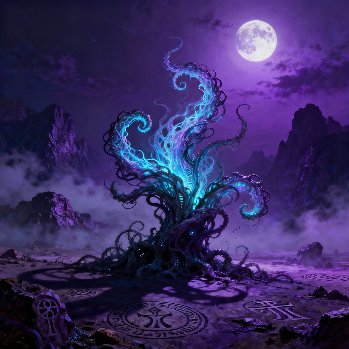 This image shows a spectral, bioluminescent phantom plant with impossible tendrils in a desolate, moonlit landscape. Rendered with a hyperrealistic digital painting style, it features haunting chiaroscuro lighting and deep, saturated purples and blues.