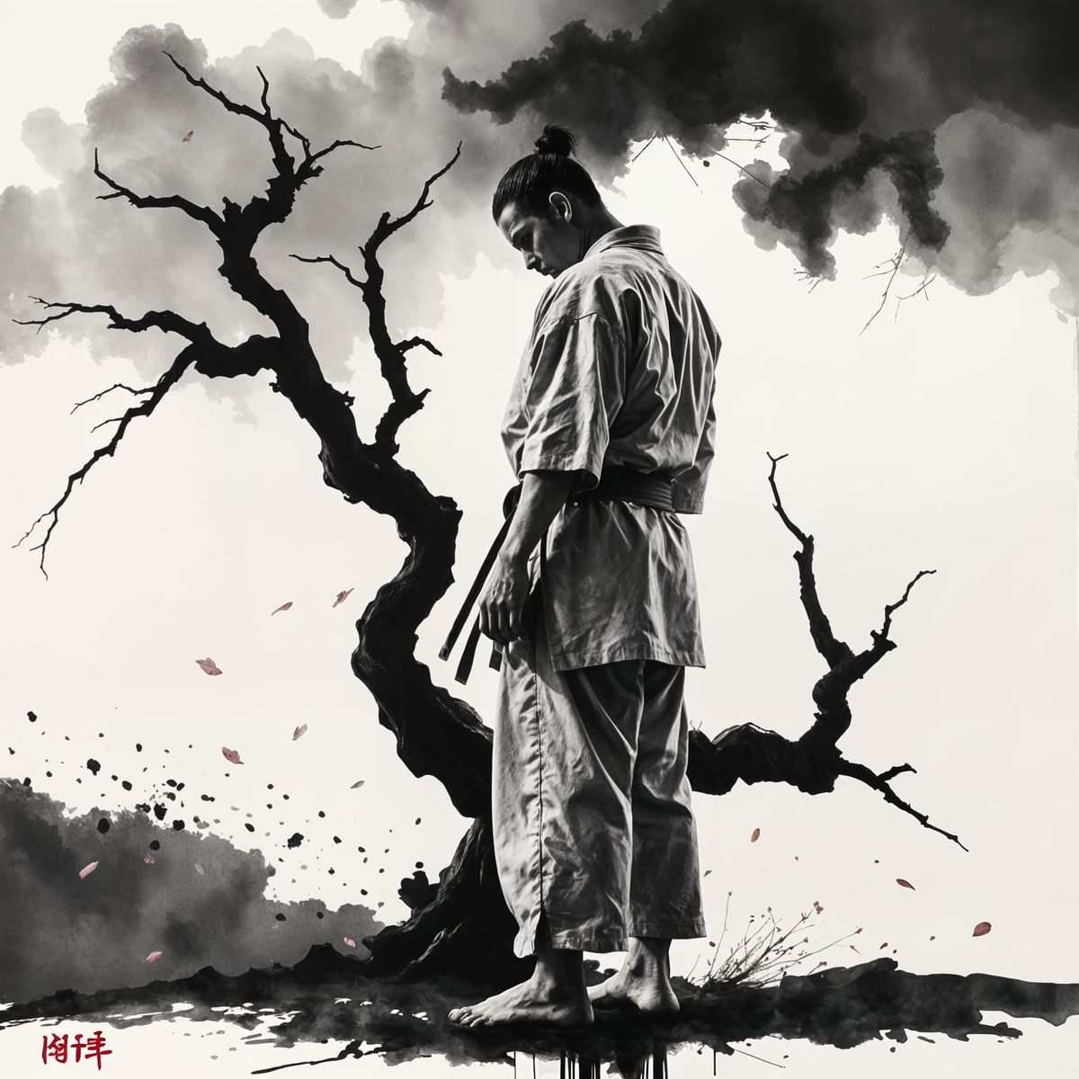 A striking picture of a lone karate warrior poised in a power stance. The figure is painted with expressive ink strokes, capturing the energy of the pose, set against a dark sakura tree and ominous sky.