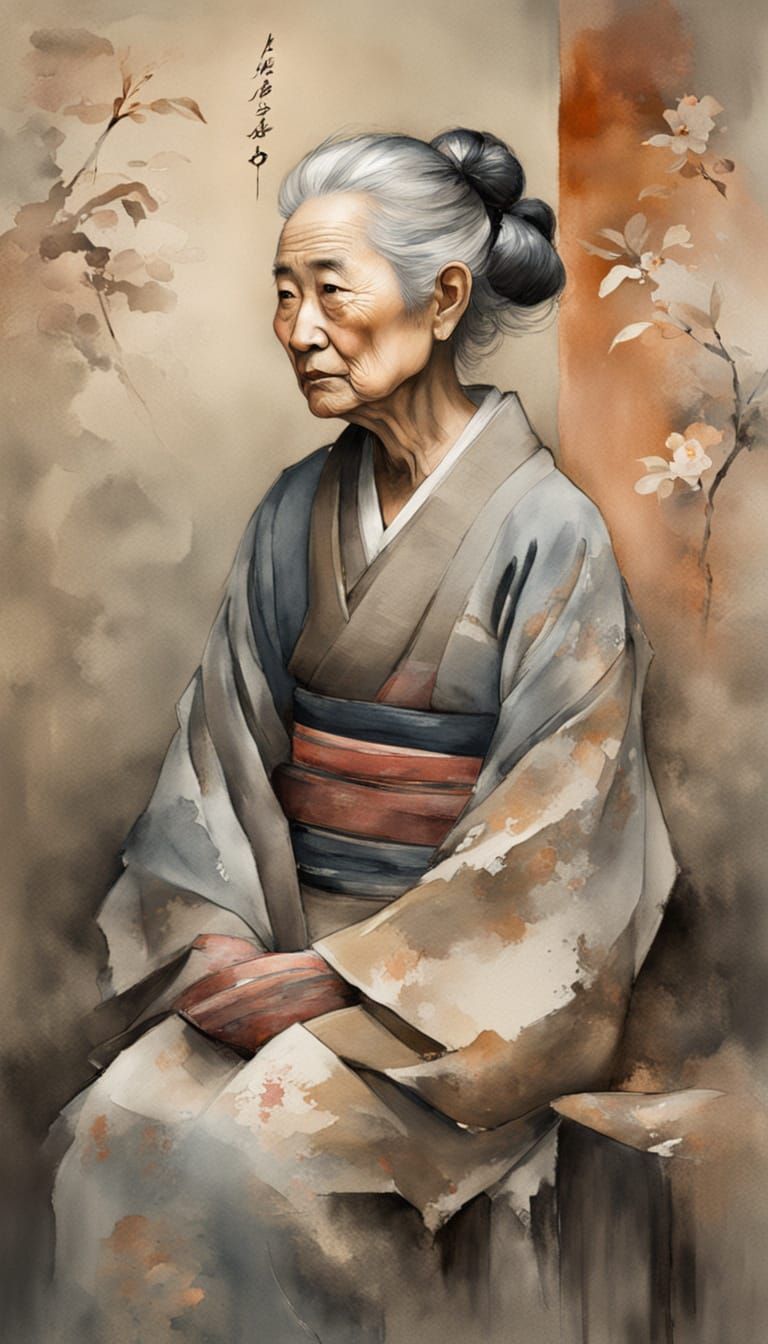 This image is a watercolor portrait of an elderly geisha with oriental features and gray hair, set against a dimly lit background reminiscent of traditional Japanese art. Delicate brushstrokes and muted colors evoke a sense of nostalgia and warmth.