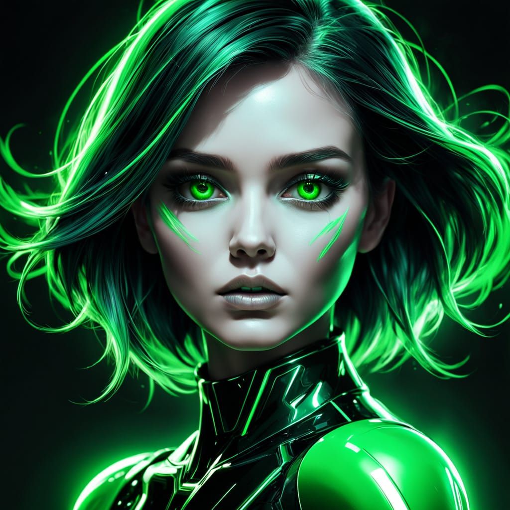 This image is a captivating close-up portrait of a woman with a striking futuristic appearance, featuring vivid green accents and a mesmerizing gaze.