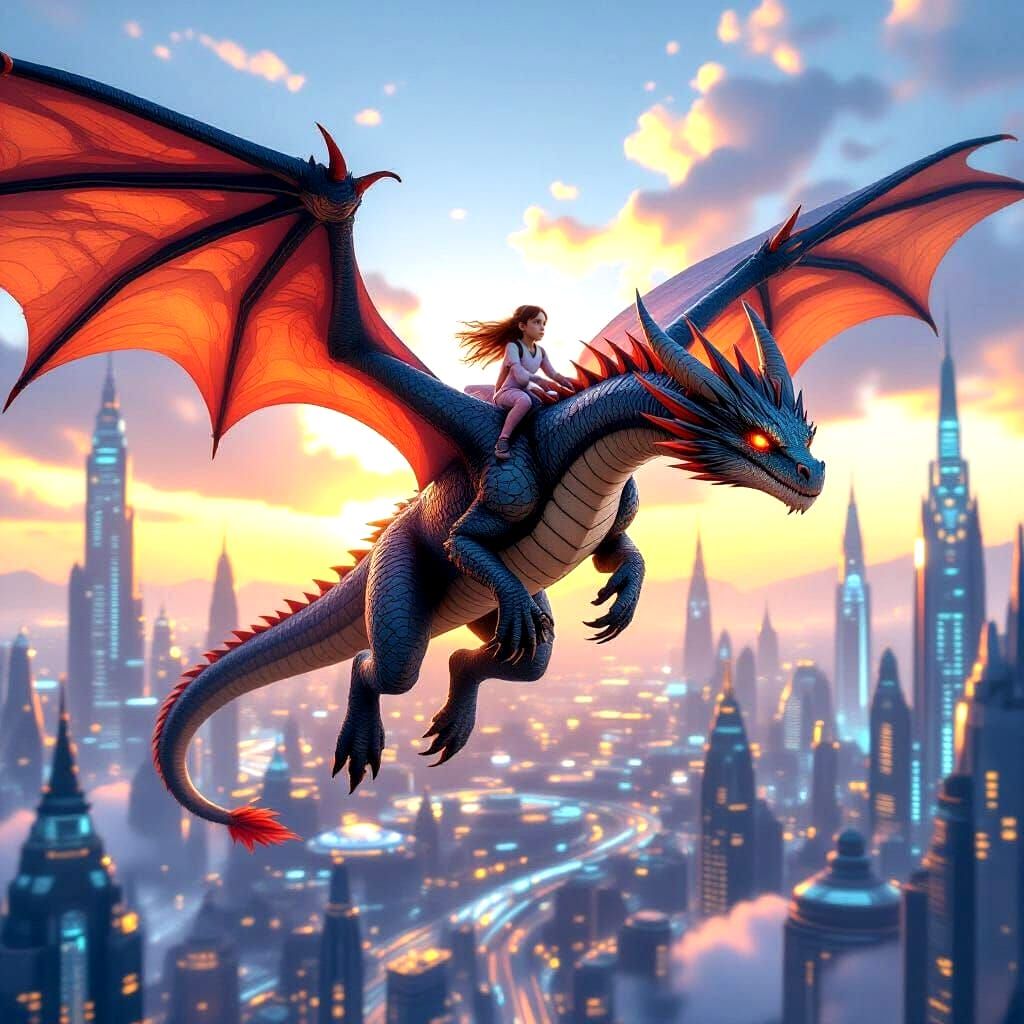 A young girl rides a powerful dragon through a detailed, futuristic city sky. Rendered with epic 3D game graphics and dynamic lighting for a cinematic feel.